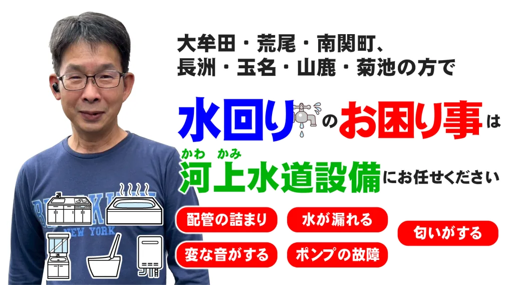 個人宅の水道の不便の解決、具体的には、水漏れ、排水の詰まり、水回りの異音や匂い、お風呂の故障、トイレの交換や修理、井戸の修理や改善などから、業務委託としての定期メンテナンスのご依頼など、水回りの事は河上水道設備へお任せください。